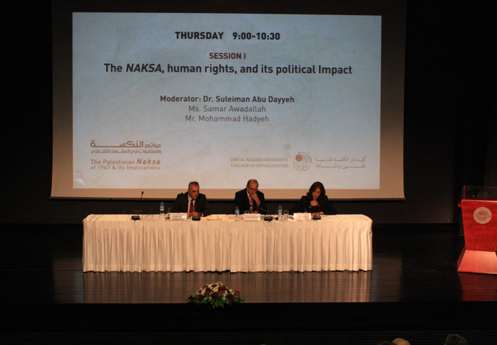 وقد ناقشت الجلسة الأولى موضوع "النكسة، حقوق الإنسان، وتأثيراتها السياسية، وقد أدار الجلسة الأستاذ سليمان ابو دية، حيث ابتدأت الجلسة بمحاضرة بعنوان " الآثار السياسية للاحتلال، منع الشعب الفلسطيني من حق تقرير المصير والحرية والاستقلال" قدمتها الأستاذة سمر عوض الله مستشار في دائرة الإعلام والتواصل في دائرة شؤون المفاوضات بمنظمة التحرير الفلسطينية، كما وقدم الأستاذ المحامي محمد هادية مستشار قانوني في دائرة شؤون المفاوضات بمنظمة التحرير الفلسطينية محاضرة ركز فيها على الناحية القانونية لفترة النكسة وما يترتب عليها من تأثيرات سياسية.