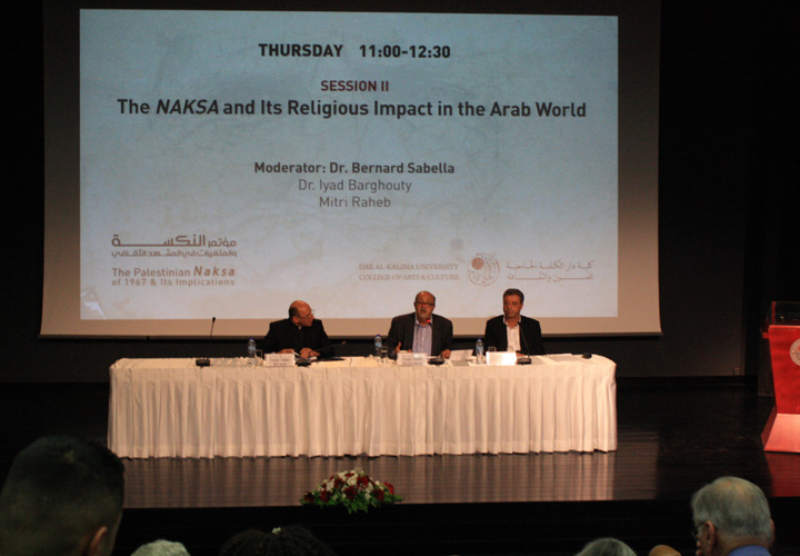 أما الجلسة الثانية فكانت بعنوان "النكسة وتأثيراتها الدينية في العالم العربي، وقد أدارها الدكتور برنارد سابيلا، وتحدث الدكتور إياد برغوثي عن اثر النكسة في الحالة الدينية في فلسطين، كما وقدم القس الدكتور متري الراهب رئيس دار الكلمة الجامعية محاضرة حول حرب 1967 وتوظيف الرمز الديني من قبل اسرائيل، وتأثير النكسة على المسيحية وعلى اللاهوتيين العرب وعلى الكنائس الإنجيلية في العالم العربي وعلى الكنيسة القبطية وعلى المسيحية الصهيونية.
