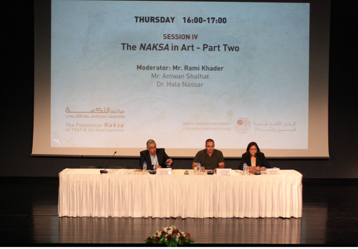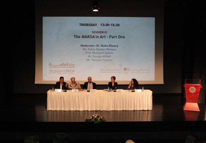 وتمحورت الجلسة الثالثة حول "النكسة في الفن"، والتي ادارتها الدكتورة نهى خوري نائب الرئيس للشؤون الأكاديمية في دار الكلمة الجامعية، حيث ناقشت فيها الفنانة فاتن فوزي نسطاس متواسي رئيسة برنامج التصميم الجرافيكي والفنون التطبيقية في دار الكلمة الجامعية ورقة بحثية حول "الفن الفلسطيني ما قبل وبعد النكسة" ، كما وقدم البروفيسور معتصم عديلة رئيس برنامج الأداء الموسيقي في دار الكلمة الجامعية محاضرة حول "النكسة، الأغنية السياسية والمقاومة"، كما واستعرض المخرج والمنتج الفلسطيني جورج خليفي خلال ورقته البحثية موضوع " تأثير النكسة على الفيلم الفلسطيني"، كما وطرح الأستاذ تحسين يقين خلال محاضرته موضوع " النكسة في السينما المصرية".