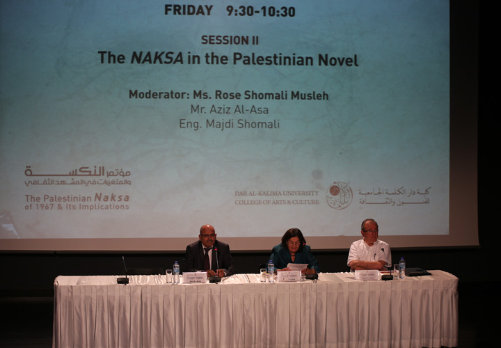كما وتميزت الجلسة الختامية بعنوان "النكسة في الرواية الفلسطينية"، والتي أدارتها الأستاذة روز شوملي مصلح، حيث قدم الكاتب والباحث الفلسطيني عزيز العصا ورقة نقدية حول رواية "ثلاثية فلسطين" للصحفي الأديب المقدسي نبيل خوري، ذكر خلالها : "أن الرواية الفلسطينية منذ العام 1967 حتى تاريخه، قد وظفت النكسة وانعكاساتها على حياة الفلسطينيين في الوطن والمهجر وفي السرد الروائي، بإعتبارها مفصلاً مهماً في حياة الشعب الفلسطيني".