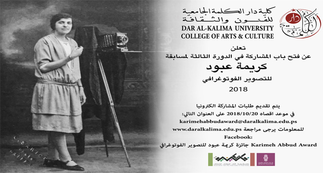 أطلقت مؤسسة دار الكلمة الجامعية للفنون والثقافة في مدينة بيت لحم وللسنة الثالثة على التوالي وبرعاية رئيسية من بنك فلسطين وبرنامج فلسطينية، مسابقة جائزة المصورة كريمة عبود للتصوير الفوتوغرافي لعام 2018، حيث ستقدم جائزة نقدية للفائزين الأربعة (ما مجموعه 3,000 دولار) وجوائز تقديرية وفرص لدراسة التصوير الفوتوغرافي، ضمن حفل خاص سيقام على مسرح دار الكلمة الجامعية في محافظة بيت لحم.