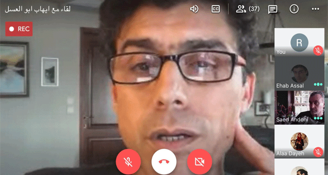 هذا وقال سائد انضوني: "لقد كنا نعمل هذه اللقاءات باستمرار خلال فترات الدوام الطبيعي والان مع فترة الحجر هذا اللقاء الثاني الذي نقوم به، اود ان اشكر المصور السينمائي ايهاب ابو العسل الذي كان كريما مع الطلبة واستفساراتهم وحاول تقديم المشورة لما فيه افادة للطلبة ".